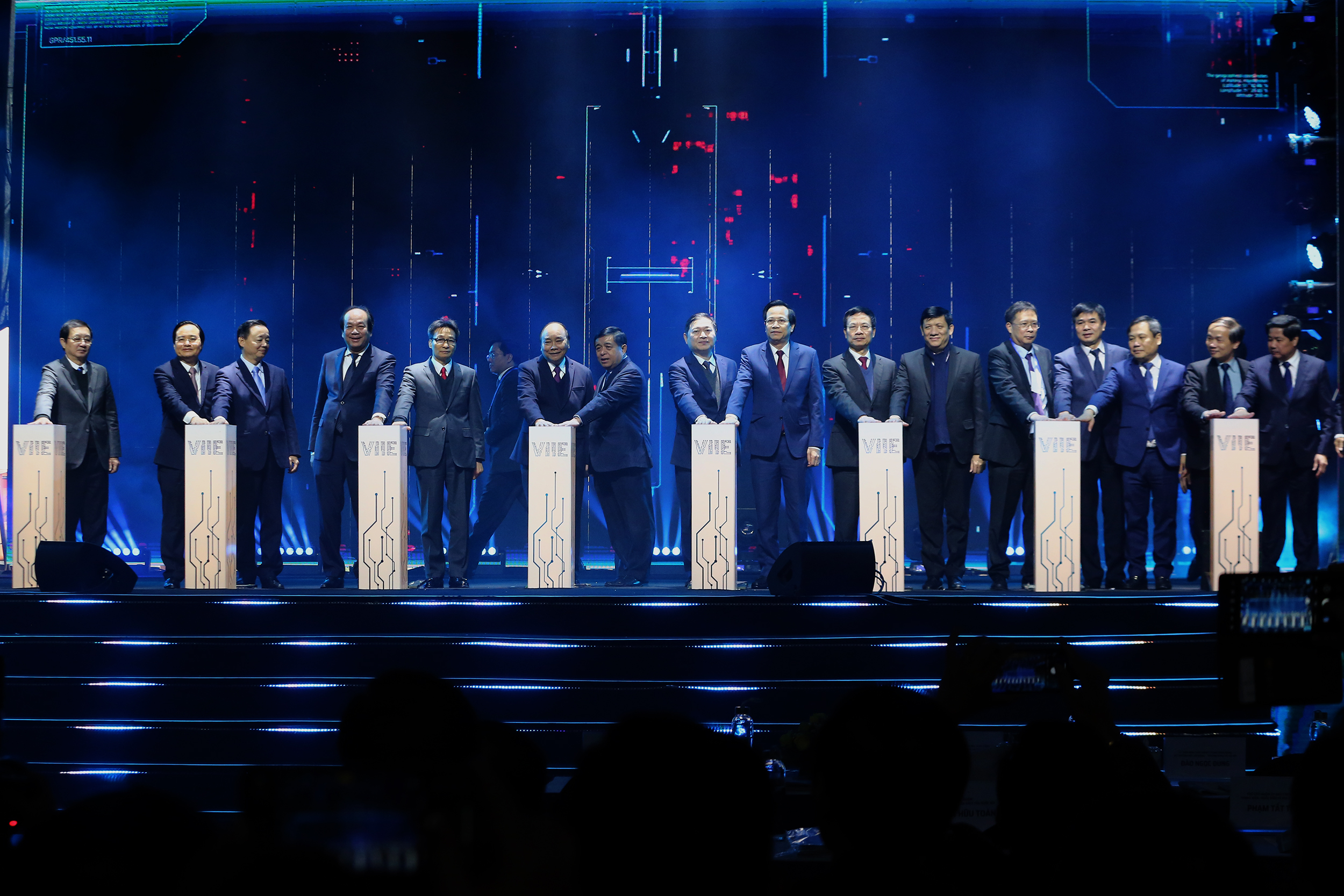 Thủ tướng Nguyễn Xuân Phúc và các đại biểu nhấn nút khởi công xây dựng Trung tâm Đổi mới sáng tạo quốc gia và khai mạc Triển lãm quốc tế đổi mới sáng tạo Việt Nam 2021.- Ảnh: VGP/Đình Nam